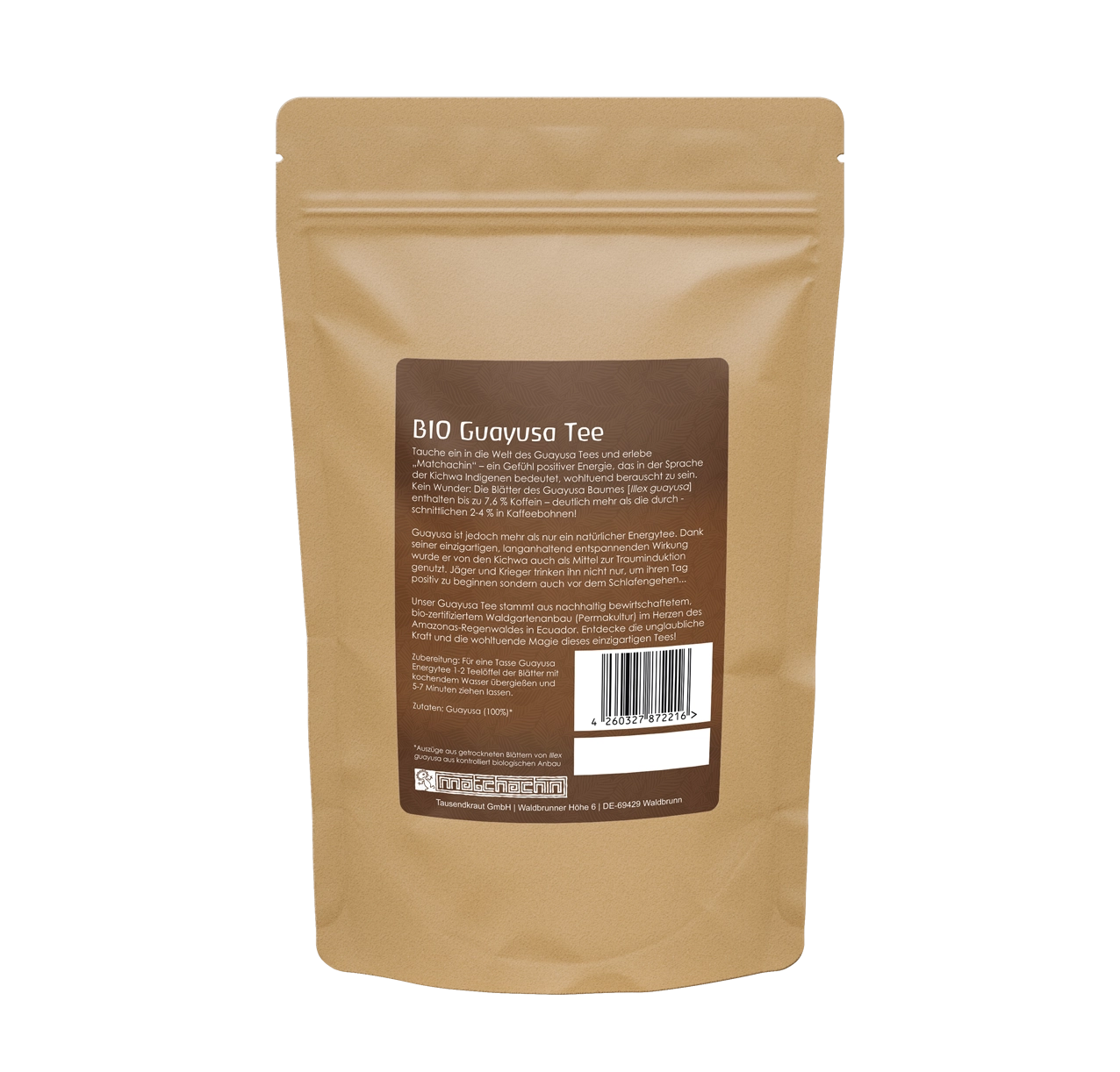 | Warnhinweis: | BIO Guayusa enthält 3% Koffein (3g pro 100g). |