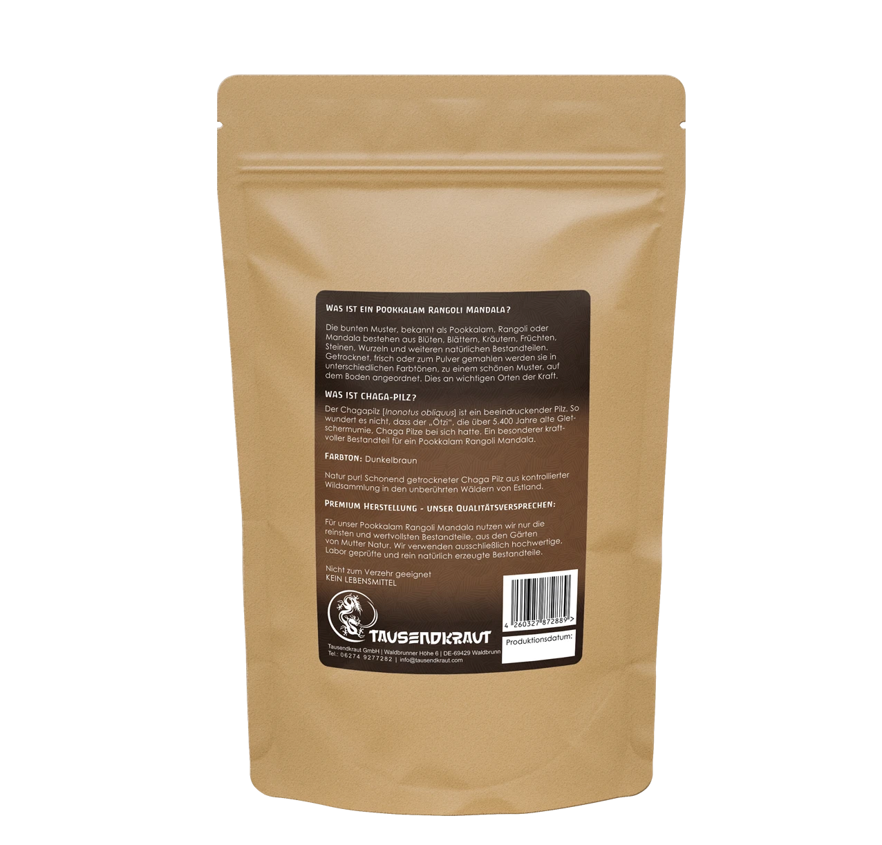 Qualitätsversprechen: Natur pur! Schonend getrockneter Chaga Pilz, zu 5-10cm großen Brocken gebrochen, aus Wildsammlung. Für unser Pookkalam Rangoli Mandala nutzen wir nur die Reinsten und Wertvollsten Bestandteile. Daher verwenden wir ausschließlich hochwertige und rein natürlich verarbeitete Bestandteile aus den Gärten von Mutter Natur.