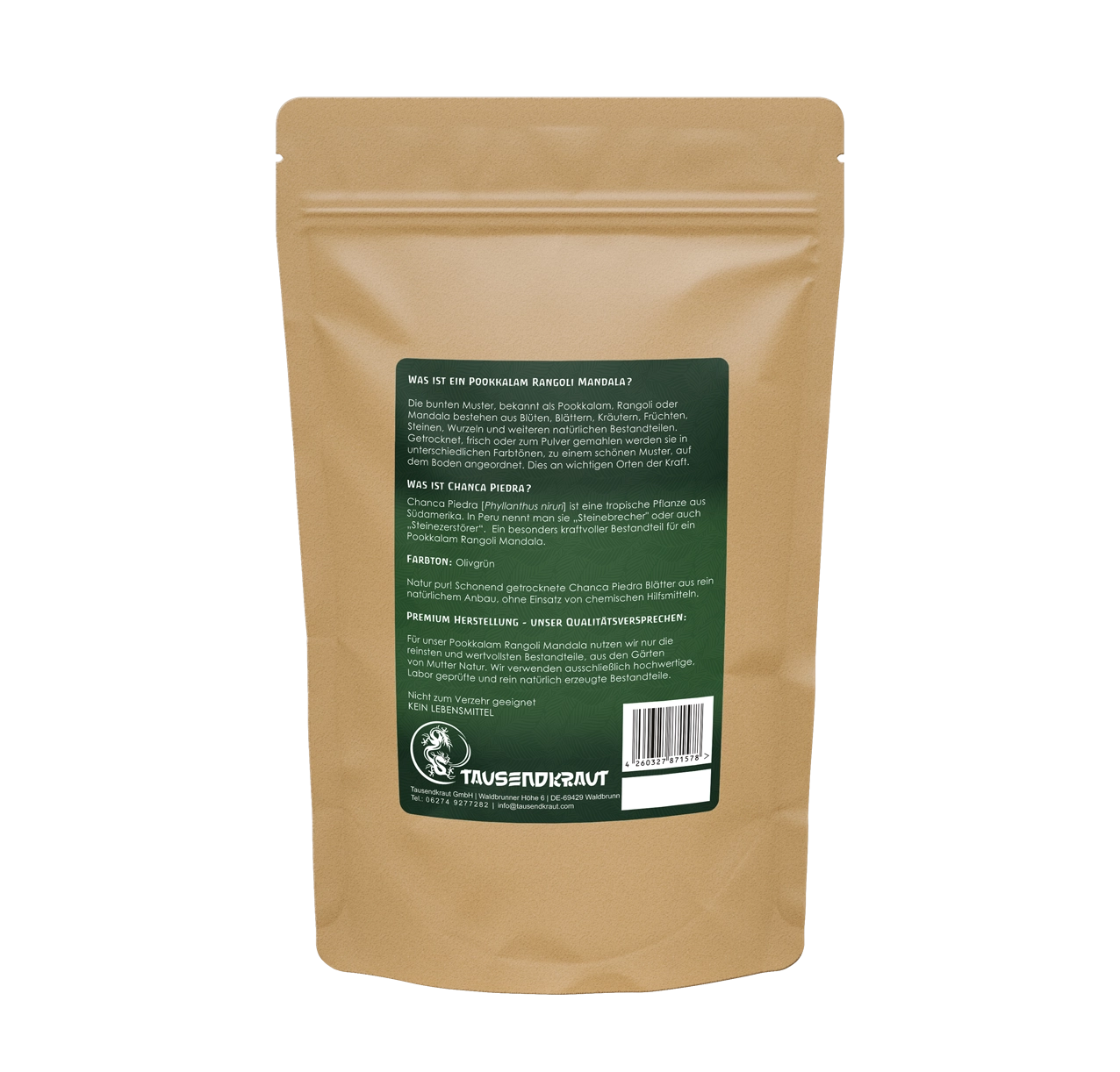 Qualitätsversprechen: Natur pur! Schonend getrocknete Chanca Piedra Blätter und Stängel aus kontrolliert biologischm Anbau (k.b.A.) via dynamischer Agro-Forstwirtschat (Permakultur), ohne Einsatz von chemischen Hilfsmitteln. Für unser Pookkalam Rangoli Mandala nutzen wir nur die Reinsten und Wertvollsten Bestandteile. Daher verwenden wir ausschließlich hochwertige und rein natürlich verarbeitete Bestandteile aus den Gärten von Mutter Natur.