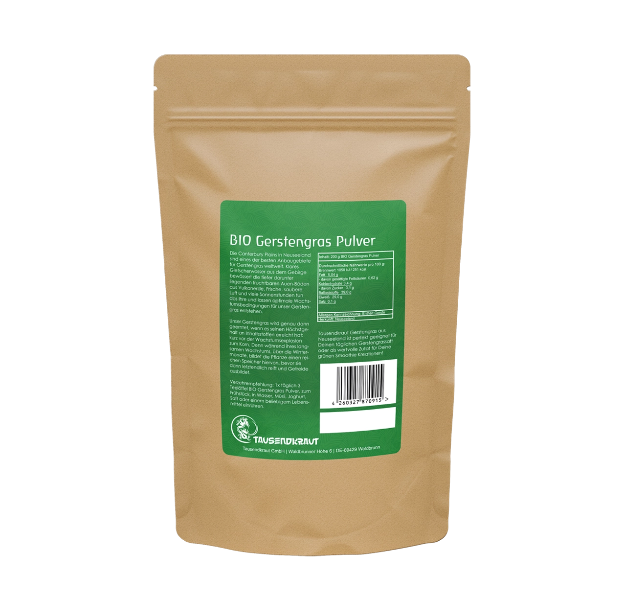 200g BIO Gerstengras Pulver in einer wiederverschließbarern Aroma Schutzverpackung