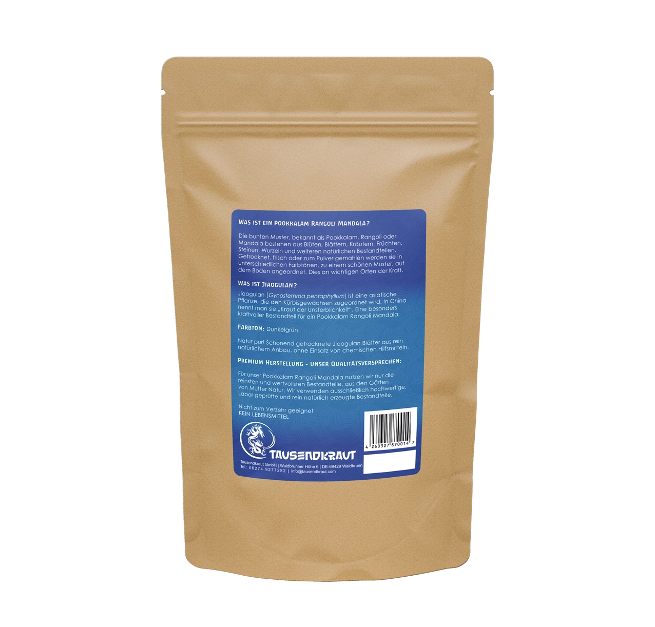 Qualitätsversprechen: Natur pur! Schonend getrocknete Jiaogulan Blätter aus rein natürlichem und geprüften Anbau, ohne Einsatz von chemischen Hilfsmitteln. Für unser Pookkalam Rangoli Mandala nutzen wir nur die Reinsten und Wertvollsten Bestandteile. Daher verwenden wir ausschließlich hochwertige und rein natürlich verarbeitete Bestandteile aus den Gärten von Mutter Natur.