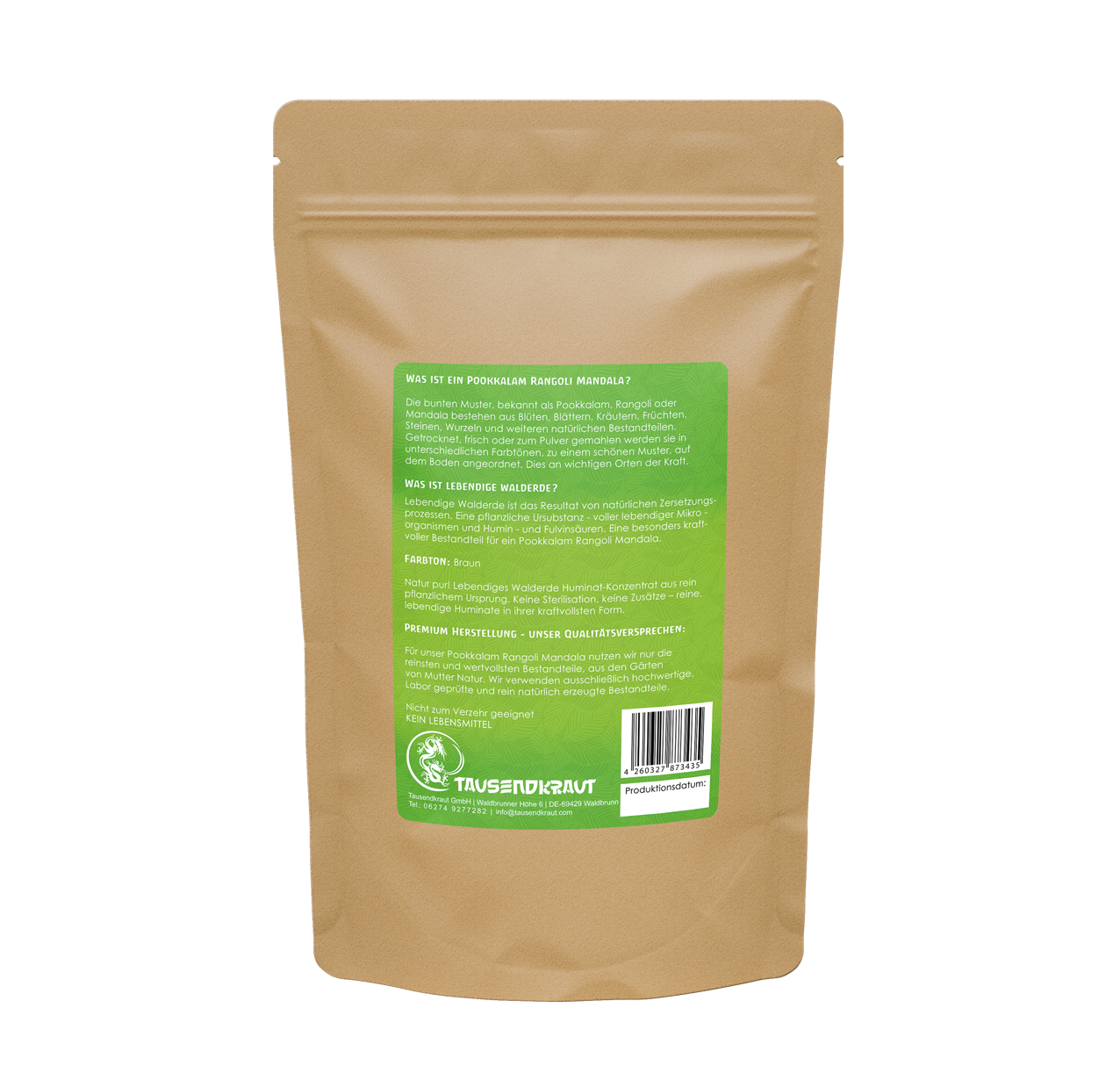 Was ist Lebendige Walderde - Huminat Konzentrat? Lebendige Walderde ist das Resultat von natürlichen Zersetzungsprozessen. Eine pflanzliche Ursubstanz - voller lebendiger Mikroorganismen und Humin - und Fulvinsäuren. Eine besonders kraftvoller Bestandteil für ein Pookkalam Rangoli Mandala.