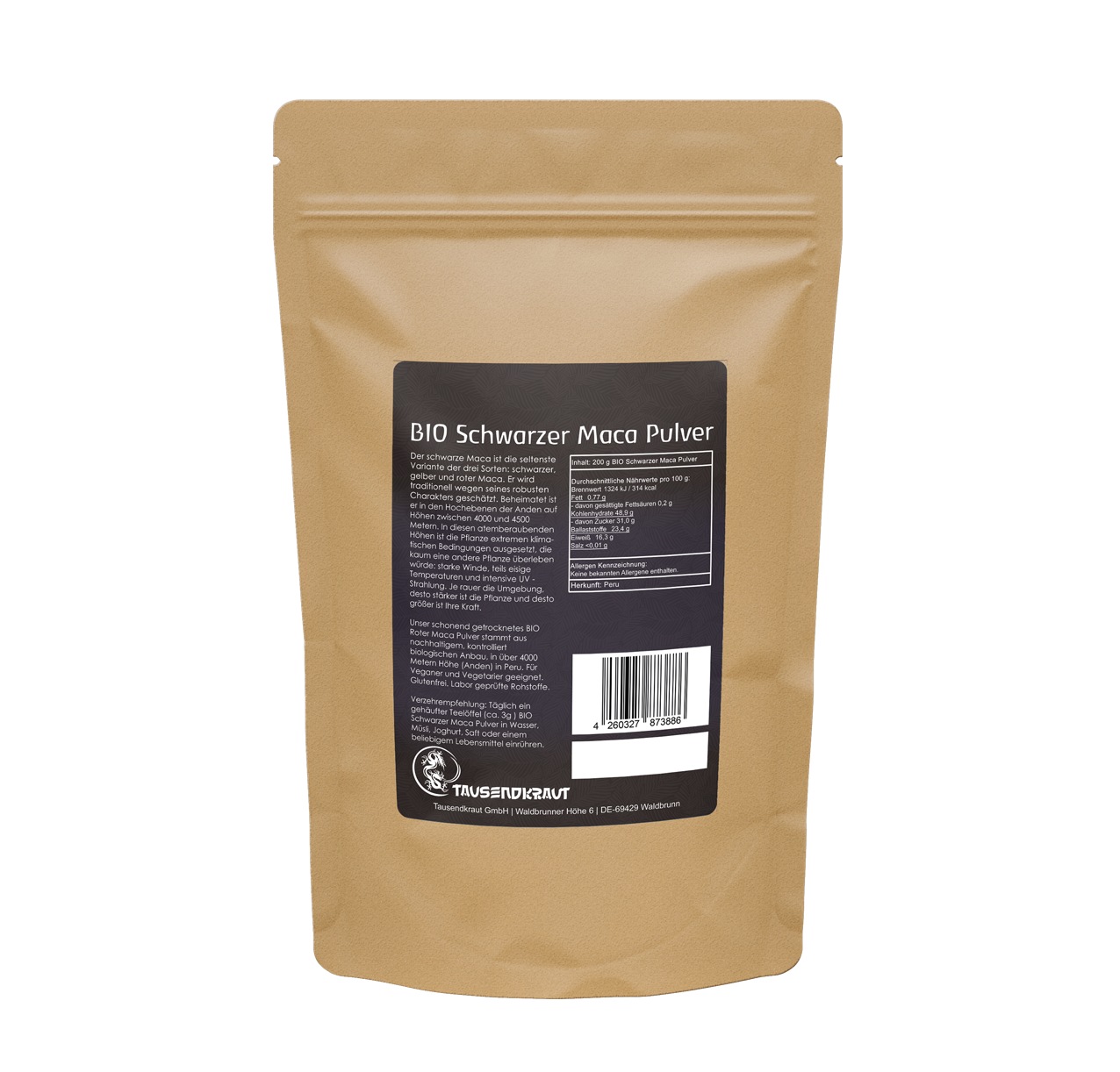 | Inhalt: | 200 g BIO Schwarzer Maca Pulver in einer wiederverschließbaren Aroma Schutzverpackung | ||||||||||||||||