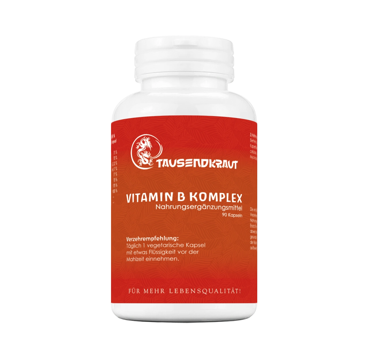 Unser Vitamin B Komplex enthält eine sorgfältig abgestimmte Mischung aller wichtigen B-Vitamine plus Myo-Inositol und Cholin , die Deinen Körper bei einer Vielzahl von Funktionen unterstützen.