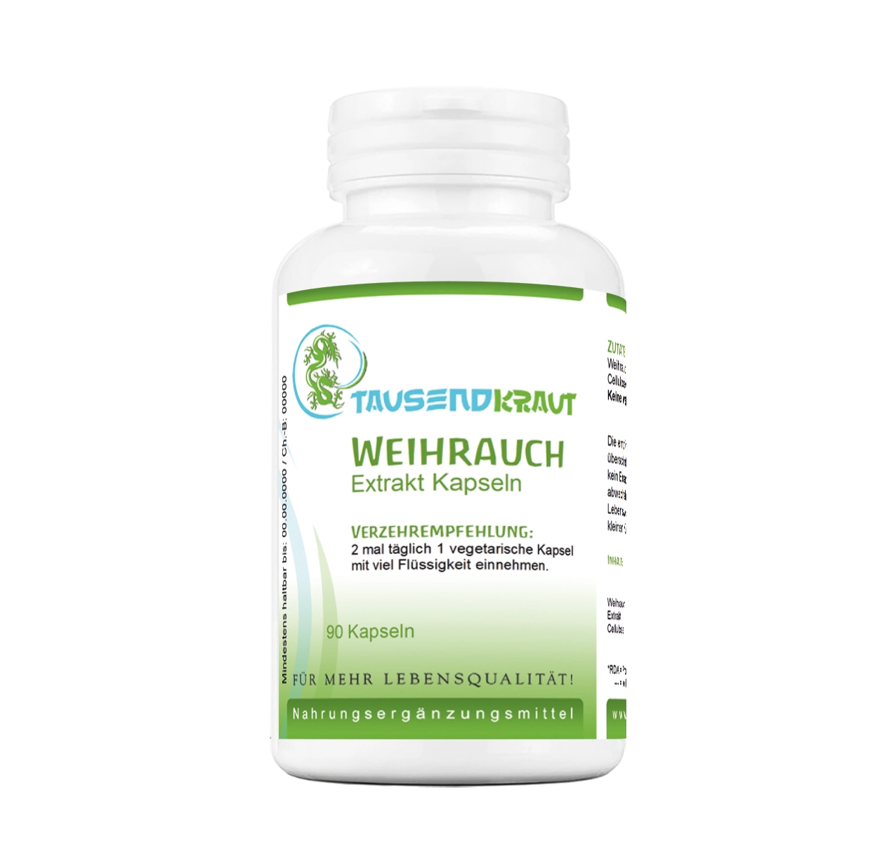 Weihrauch Extrakt* (Boswellia serrata), E464 (vegetarische Kapselhülle): Hydroxypropylmethylcellulose, Cellulose (Füllstoff) * enthält 80% Boswelia Säuren |